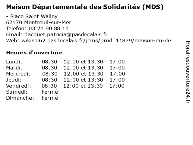 1 Maison Départementale des Solidarités (MDS) (Distance: 10,72 km) 31 rue de la Pierre Trouée, 62630 Etaples administration, departement, des, départementale, informations, maison, mds, public, services, solidarités 2 Maison Départementale des Solidarités (MDS) (Distance: 13,59 km) 9 résidence André Fatoux, 62600 Berck administration, departement, des, départementale, informations, maison, mds, public, services, solidarités 3 Office notarial (Bernard Ramon) (Distance: 10,51 km) 18 Place du General De Gaulle, 62630 Etaples bernard, conseils, informations, notarial, office, ramon, successions 4 Maison Départementale des Solidarités (MDS) (Distance: 22,19 km) 6 avenue Sainte Austreberthe, 62140 Marconne administration, departement, des, départementale, informations, maison, mds, public, services, solidarités 5 Maison Départementale des Solidarités (MDS) (Distance: 29,96 km) 153 rue de Brequerecque, 62200 Boulogne-Sur-Mer administration, departement, des, départementale, informations, maison, mds, public, services, solidarités 6 Maison Départementale des Solidarités (MDS) (Distance: 31,72 km) 34 rue Anne Franck, 62280 Saint-Martin-les-Boulogne administration, departement, des, départementale, informations, maison, mds, public, services, solidarités |