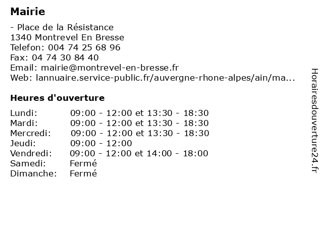 2 Mairie (Distance: 5,75 km) 305 grande rue, 01340 Attignat commune, de, hotel, mairie, public, service, ville 3 Mairie (Distance: 6,24 km) 52 route de Bourg, 01310 Saint-Martin-le-Châtel administration, mairie, publique 5 Mairie (Distance: 7,31 km) 5 place de la Mairie, 01560 St Julien Sur Reyssouze administration, mairie, publique 6 |