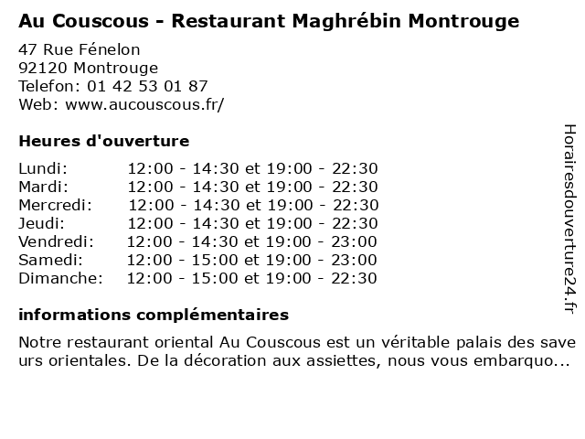 Termes de recherche pour Au Couscous - Restaurant Maghrébin Montrouge:restaurant, montrouge, au, couscous, restaurant marocain, restaurant familial, restaurant africain, maghrebin |