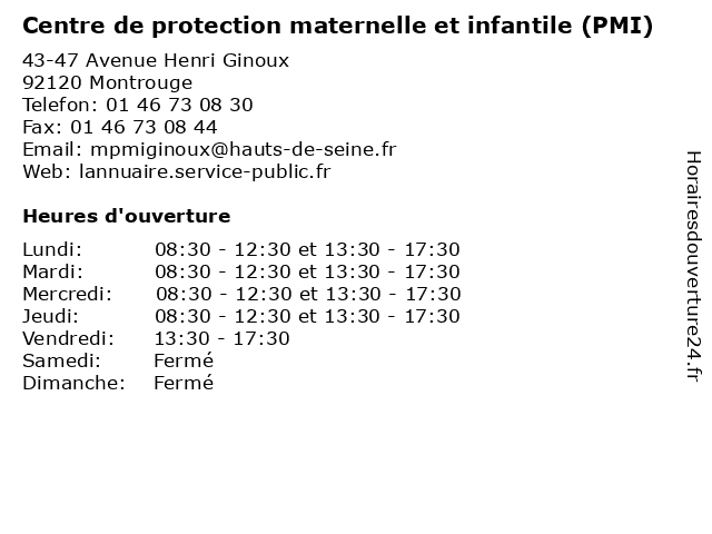 1 Centre de protection maternelle et infantile (PMI) (Distance: 0,95 km) - 3e Avenue, 94250 Gentilly centre, conseils, de, et, infantile, maternelle, parents, pmi, protection, prévention, puéricultrice, pédiatre 2 Centre de protection maternelle et infantile (PMI) (Distance: 1,14 km) 112 Avenue Marx Dormoy, 92120 Montrouge administration, assoc, associations, aux, centre, d'information, de, des, dédié, et, greffe, infantile, information, local, locale, maternelle, mission, personnes, pmi, protection 3 Centre de protection maternelle et infantile (PMI) (Distance: 1,50 km) 4 Rue Augustine Variot, 92240 Malakoff centre, conseils, de, et, infantile, maternelle, parents, pmi, protection, prévention, puéricultrice, pédiatre 4 Centre de protection maternelle et infantile (PMI) (Distance: 1,50 km) 74 Rue Jean Marin Naudin, 92220 Bagneux administration, assoc, associations, aux, centre, d'information, de, des, dédié, et, greffe, infantile, information, local, locale, maternelle, mission, personnes, pmi, protection 5 Centre de protection maternelle et infantile (PMI) (Distance: 1,69 km) 3 place de la Garenne, 75014 Paris administration, assoc, associations, aux, centre, d'information, de, des, dédié, et, greffe, infantile, information, local, locale, maternelle, mission, personnes, pmi, protection 6 Centre de protection maternelle et infantile (PMI) (Distance: 1,99 km) 20 Rue du Soleil-Levant, 94250 Gentilly centre, conseils, de, et, infantile, maternelle, parents, pmi, protection, prévention, puéricultrice, pédiatre |