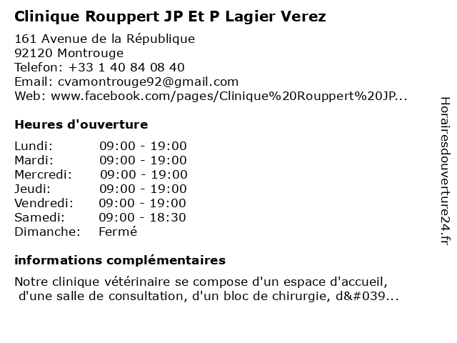1 Clinique Rouppert Jp Et P Lagier Verez (Distance: 6,18 km) 35 Avenue Léon Blum, 92350 Le Plessis-Robinson clinique, et, jp, lagier, rouppert, verez 2 Clinique Vétérinaire Mon Véto Montrouge (Distance: 0,65 km) 92 Avenue Jean Jaurès, 92120 Montrouge clinique, mon, montrouge, véto, vétérinaire 3 Clinique Vétérinaire Mon Véto Montrouge (Distance: 0,67 km) 73 Avenue de la République, 92120 Montrouge clinique, mon, montrouge, véto, vétérinaire 4 Clinique Vétérinaire du Docteur Alexandre (Distance: 0,92 km) 9 Avenue de la Marne, 92120 Montrouge alexandre, clinique, docteur, du, vétérinaire 5 Clinique vétérinaire de Malakoff - Sevetys (Distance: 1,88 km) 32 Rue Avaulée, 92240 Malakoff clinique, de, malakoff, sevetys, vétérinaire 6 |