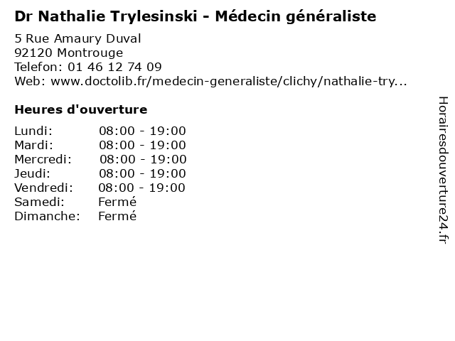 1 Dr Nathalie Trylesinski - Médecin généraliste (Distance: 8,36 km) 22 Rue Marcadet, 75018 Paris dr, généraliste, généraux, médecin, nathalie, soins, trylesinski 2 Nathalie Verpillat - Pédicure-podologue (Distance: 0,74 km) 18 Rue Poirier de Narçay, 75014 Paris cheville, nathalie, orteil, pied, podologue, pédicure, verpillat 3 Nathalie Violle - Gestalt Thérapie (Distance: 1,37 km) 125 boulevard Gabriel Péri, 92240 Malakoff gestalt, nathalie, thérapie, violle 4 Dr Nathalie Lerolle - Spécialiste en médecine interne (Distance: 1,44 km) 74 Avenue Pierre Larousse, 92240 Malakoff consultation, docteur, dr, en, interne, lerolle, med, médecin, médecine, nathalie, spécialiste, traitement 5 Dr Marie-Nathalie Jeanteur - Ophtalmologue (Distance: 1,67 km) 185 Rue Raymond Losserand, 75014 Paris 75014, dr, glaucome, institut, jeanteur, marie, nathalie, ophtalmologue, paris 6 |