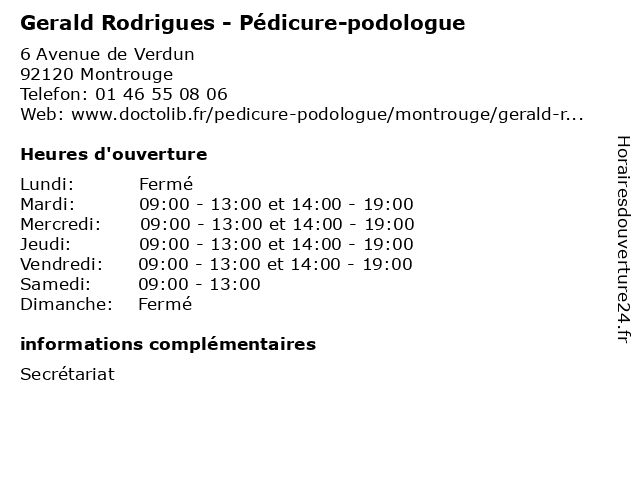 1 Clément Goutal - Pédicure-podologue (Distance: 0,83 km) 206 Avenue Marx Dormoy, 92120 Montrouge cheville, clément, goutal, orteil, pied, podologue, pédicure 2 Lucile Goussin - Pédicure-podologue (Distance: 1,23 km) 51 Rue Gambetta, 92240 Malakoff goussin, lucile, médecin, médecine, médical, pharmaceutique, podologue, pédicure, traitement 3 Anthony Pin - Pédicure-podologue (Distance: 2,19 km) 92 Rue de Gergovie, 75014 Paris anthony, docteur, médecin, pin, podologue, pédicure 4 Alexandre Musso - Pédicure-podologue (Distance: 2,19 km) 92 Rue de Gergovie, 75014 Paris alexandre, docteur, musso, médecin, podologue, pédicure 5 Pierre Vallet - Pédicure-podologue (Distance: 2,47 km) 9 Square Victor Schoelcher, 92220 Bagneux cheville, orteil, pied, pierre, podologue, pédicure, vallet 6 Sylvie Moreau-Pette - Pédicure-podologue (Distance: 3,03 km) 32 Rue du Cotentin, 75015 Paris cheville, moreau, orteil, pette, pied, podologue, pédicure, sylvie |