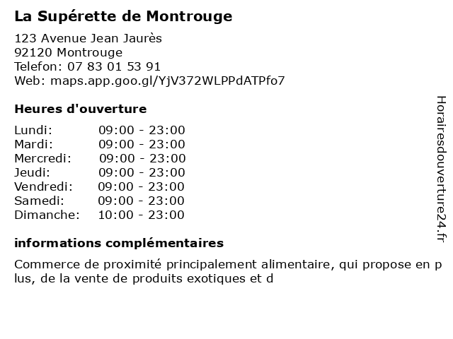 1 Epicerie Supérette Champerret (Distance: 8,07 km) 5 place de la Porte de Champerret, 75017 Paris alimentation, boisson, champerret, epicerie, superette, supérette, épicerie 2 Supérette de Clignancourt (Distance: 9,72 km) 102 Boulevard Ney, 75018 Paris clignancourt, de, supérette 3 La Baraka Supérette (Distance: 12,07 km) 35 Boulevard Aristide Briand, 93100 Montreuil alimentation, baraka, boissons, la, supérette, épicerie 4 Supérette de la Marne (Distance: 12,41 km) 2 boulevard de la Marne, 94130 Nogent-sur-Marne alimentation, de, fine, fruits, la, légumes, marne, supérette, épicerie 5 La Supérette de la Gare (Distance: 13,33 km) 5 Rue de la Gare, 94290 Villeneuve-le-Roi alimentation, boissons, de, epiceries, gare, la, superette, supérette 6 AXA Chamorel Fréderic Agent général (Distance: 0,65 km) 115 Boulevard Gabriel Péri, 92240 Malakoff agent, axa, chamorel, fréderic, général |