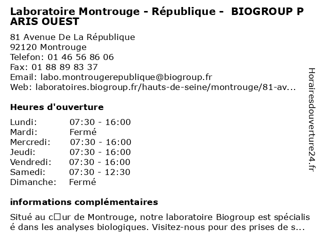 Termes de recherche pour Laboratoire Montrouge - République - BIOGROUP PARIS OUEST:montrouge, paris, laboratoire, republique, ouest, biogroup, dépistages, laboratoire de diagnostic |