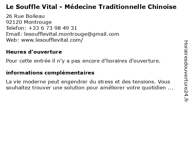 1 Le Souffle Vital - Médecine Traditionnelle Chinoise (Distance: 0,00 km) 26 Rue Boileau, 92120 Montrouge chinoise, le, médecine, souffle, traditionnelle, vital 2 Le Souffle Vital - Médecine Traditionnelle Chinoise (Distance: 0,00 km) 26 Rue Boileau, 92120 Montrouge chinoise, le, médecine, souffle, traditionnelle, vital 3 Bibliothèque Universitaire Faculté de Médecine (11-13 Juillet-16-19Aout)) (Distance: 2,48 km) 63 Rue Gabriel Péri, 94276 Le Kremlin-Bicetre 11, 13, 16, 19aout, bibliothèque, de, faculté, juillet, librarie, médecine, médiathèque, services, universitaire, université 4 AHT - Atelier d'Horlogerie Traditionnelle (Distance: 3,18 km) 36 Rue du Hameau, 75015 Paris aht, atelier, d'horlogerie, horlogerie, laboratoire, paris, traditionnelle 5 Man'ouché - Galette Traditionnelle Libanaise (Distance: 6,01 km) 62 Rue Rambuteau, 75003 Paris cuisine, galette, libanaise, man'ouché, restaurant, restauration, spécialités, traditionnelle 6 Dr. Michel Frey - Médecine générale - Acupuncture Traditionnelle (Distance: 7,00 km) 92 rue de la Victoire, 75009 Paris acupuncture, consultation, docteur, dr., frey, générale, michel, médecine, santé, traditionnelle |