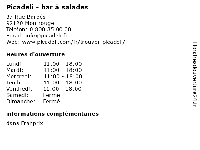 1 Picadeli - bar à salades (Distance: 1,71 km) 5 rue Dareau, 75014 Paris bar, boisson, fastfood, picadeli, restauration, salades 2 Picadeli - bar à salades (Distance: 2,90 km) 121 Boulevard Saint Michel, 75005 Paris bar, boisson, fastfood, picadeli, restauration, salades 3 Picadeli - bar à salades (Distance: 2,93 km) 122 Boulevard Raspail, 75006 Paris bar, boisson, fastfood, picadeli, restauration, salades 4 Picadeli - bar à salades (Distance: 3,72 km) 13 rue Eblé, 75007 Paris bar, boisson, fastfood, picadeli, restauration, salades 5 Picadeli - bar à salades (Distance: 3,73 km) 25-27 Rue Pierre Brossolette, 94200 Ivry-sur-Seine bar, boisson, fastfood, picadeli, restauration, salades 6 Picadeli - bar à salades (Distance: 3,78 km) 13-15bis boulevard Vincent Auriol, 75013 Paris bar, boisson, fastfood, picadeli, restauration, salades |