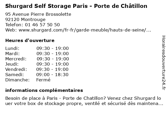 1 Shurgard (Distance: 0,03 km) 95 avenue Pierre Brossolette, 92120 Montrouge déménagement, entreprises, self stockage, shurgard, stockage d'archives 2 Shurgard (Heures d'accès) (Distance: 0,03 km) 95 Avenue Pierre Brossolette, 92120 Montrouge d'accès, déménagement, entreprises, heures, self stockage, shurgard, stockage d'archives 3 Aparthotel Adagio Paris Malakoff Châtillon (Distance: 0,11 km) 60 Avenue Pierre Brossolette, 92240 Malakoff adagio, aparthotel, châtillon, malakoff, paris 4 Aparthotel Adagio Paris Montrouge (Distance: 0,21 km) 96 Rue Gabriel Peri, 92120 Montrouge adagio, aparthotel, montrouge, paris 5 SAMSIC FACILITY PARIS XIII | Entreprise de nettoyage (Distance: 0,28 km) 36 Avenue Pierre Brosselette, 92240 Malakoff accueil en entreprise, de, energy management, entreprise, environnement, espace verts, facility, facility management, factotum, gestion des déchets, gestion du bâtiment, handyman, hygiène 3d, logistique, maintenance multitechnique, nettoyage, nettoyage industriel, paris, propreté, propreté agro-alimentaire, propreté pharmaceutique, samsic, sureté, sécurité, ultrapropreté, xiii 6 Comfort Hotel Sixteen Paris Montrouge - Closed (Distance: 0,33 km) 16 Place jean jaures, 92120 Montrouge closed, comfort, hotel, montrouge, paris, sixteen |