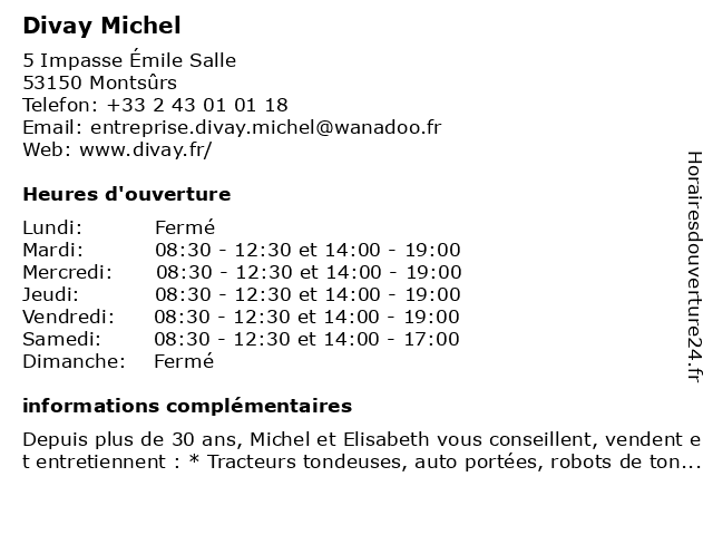2 Médiathèque Michel Nicolas (Distance: 11,07 km) - Place Pierre Mendès-France, 53600 Evron cd, dvd, livres, mediatheque, michel, médiathèque, nicolas, revues 3 Transports Michel Morin (Distance: 12,42 km) 3 Rue Denis Papin, 53950 Louverné michel, morin, transports 4 Hegy Teddy Karime Michel (Distance: 16,44 km) 53 Rue Hebert, 53000 Laval hegy, karime, michel, restaurants, teddy 5 Boulain Michel Travaux Agricoles (Distance: 16,90 km) 2 Le Buat, 53810 Changé agricoles, boulain, michel, travaux 6 COHIN JEAN MICHEL ROBERT (Distance: 17,50 km) 14 Boulevard des Manouvriers, 53810 Changé cohin, jean, michel, robert |