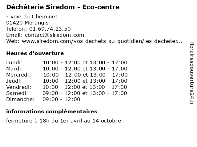 1 Déchèterie Siredom - Eco-centre (Distance: 4,09 km) - Rue de la Croix Ronde, 91360 Épinay-sur-Orge centre, centres, collecte, déchets, déchèterie, eco, ménagères, ordures, recyclage, siredom, éco 2 Déchèterie Siredom - Eco-centre (Distance: 5,59 km) - Chemin de Port Courcel, 91270 Vigneux-sur-Seine centre, centres, collecte, déchets, déchèterie, eco, ménagères, ordures, recyclage, siredom, éco 3 Déchèterie Siredom - Eco-centre (Distance: 8,16 km) - Avenue Paul Langevin, 91130 Ris-Orangis centre, centres, collecte, déchets, déchèterie, eco, ménagères, ordures, recyclage, siredom, éco 4 Déchèterie Siredom - Eco-centre (Distance: 8,50 km) - Place Mireille Valeau, 91230 Montgeron centre, centres, collecte, déchets, déchèterie, eco, ménagères, ordures, recyclage, siredom, éco 5 Déchèterie Siredom - Eco-centre (Distance: 9,74 km) - Rue Diderot, 91240 Saint-Michel-sur-Orge centre, centres, collecte, déchets, déchèterie, eco, ménagères, ordures, recyclage, siredom, éco 6 Déchèterie Siredom - Eco-centre (Distance: 9,77 km) - Chemin des Boeufs, 91620 Nozay centre, centres, collecte, déchets, déchèterie, eco, ménagères, ordures, recyclage, siredom, éco |