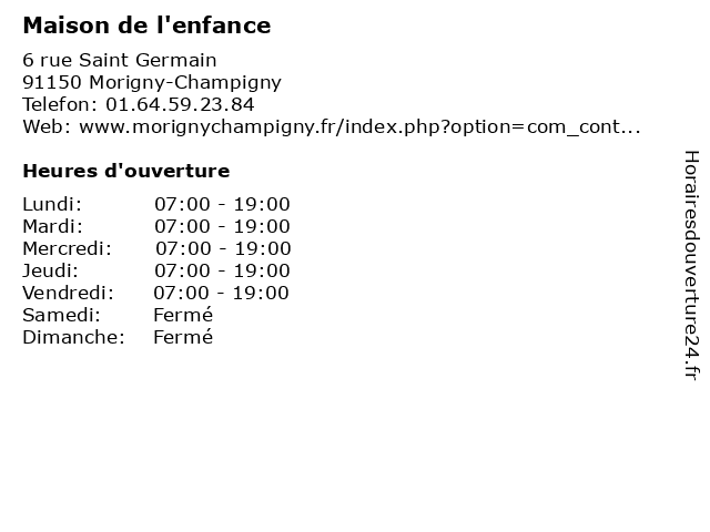 1 Multi-Accueil Petite Enfance (Distance: 16,54 km) - Place des Tilleuls, 91340 Ollainville accueil, creche, enfance, enfants, garde, multi, petite 2 Accueil de Loisirs (Distance: 0,04 km) 8 rue Saint Germain, 91150 Morigny-Champigny accueil, cd audio, cd.rom, de, livres, loisirs, revues 3 Accueil de loisirs - vacances scolaires (Distance: 0,04 km) 8 rue Saint Germain, 91150 Morigny-Champigny accueil, cd audio, cd.rom, de, livres, loisirs, revues, scolaires, vacances 4 Bibliothèque intercommunale (Distance: 0,17 km) 3 rue au Comte, 91150 Morigny-Champigny bibliothèque, cd audio, cd.rom, intercommunale, livres, revues 5 Bibliothèque Ulysse - Secteur adultes (Distance: 1,90 km) 4 Rue Sainte-Croix, 91150 Étampes adultes, bibliothèque, cd audio, cd.rom, livres, revues, secteur, ulysse 6 Bibliothèque Ulysse - Secteur jeunesse (Distance: 1,90 km) 4 Rue Sainte-Croix, 91150 Étampes bibliothèque, cd audio, cd.rom, jeunesse, livres, revues, secteur, ulysse |