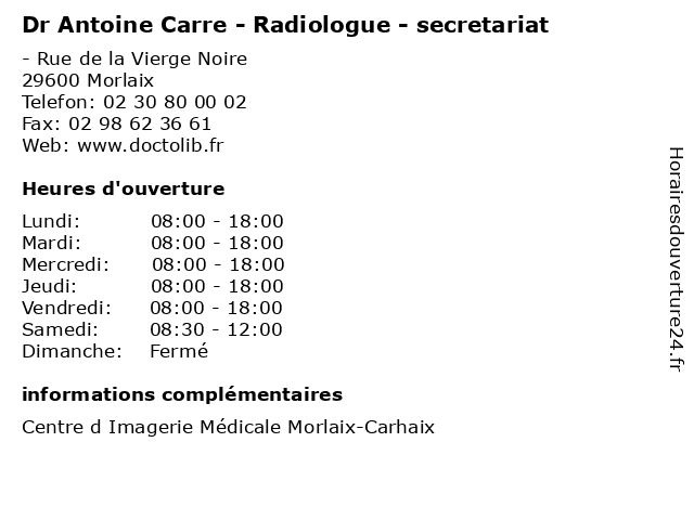 1 Dr Antoine Carre - Radiologue - secretariat (Distance: 1,49 km) 17 Rue de Paris, 29600 Morlaix antoine, carre, centre imagerie, dr, médecin, médecine, médical, pharmaceutique, radiologue, secretariat, traitement 2 Dr Antoine Carre - Radiologue - secretariat (Distance: 2,21 km) - Rue de Kersaint Gilly, 29600 Morlaix antoine, carre, centre imagerie, dr, médecin, médecine, médical, pharmaceutique, radiologue, secretariat, traitement 3 Dr Ronan Bourles - Radiologue - secretariat (Distance: 0,00 km) - Rue de la Vierge Noire, 29600 Morlaix bourles, dr, médecin, médecine, médical, pharmaceutique, radiologue, ronan, secretariat, traitement 4 Dr Pierre Calarn - Radiologue - secretariat (Distance: 0,00 km) - Rue de la Vierge Noire, 29600 Morlaix calarn, dr, médecin, médecine, médical, pharmaceutique, pierre, radiologue, secretariat, traitement 5 Dr Benoît Guivarch - Radiologue - secretariat (Distance: 0,00 km) - Rue de la Vierge Noire, 29600 Morlaix benoît, dr, guivarch, médecin, médecine, médical, pharmaceutique, radiologue, secretariat, traitement 6 Antoine Morvan - Ostéopathe (Distance: 0,78 km) 42b Quai du Léon, 29600 Morlaix antoine, morvan, ostéo, ostéopathe, ostéopathes, soins |