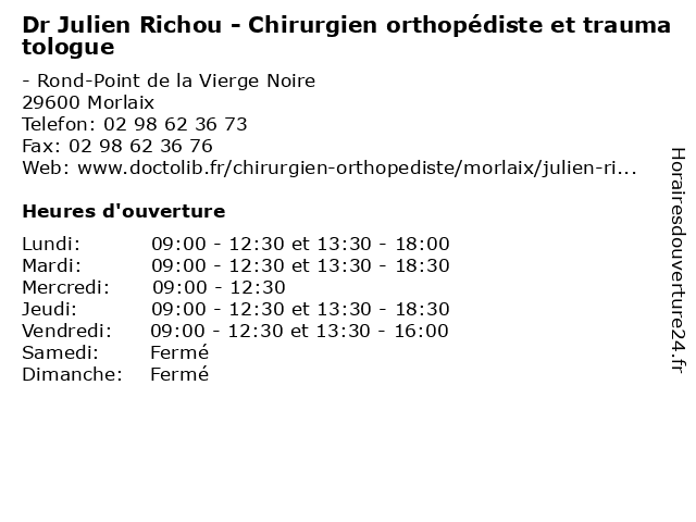 1 Dr Julien Richou - Chirurgien orthopédiste et traumatologue (Distance: 0,29 km) - Lieu Dit La Vierge Noire, 29600 Morlaix chirurgie, chirurgien, dr, et, general, julien, orthopédiste, richou, soins, traumatologue 2 Silvert Julien - Diététicienne (Distance: 2,34 km) 30 Rue de Callac, 29600 Morlaix diététicien, diététicienne, julien, repas, régime alimentaire, santé, silvert 3 Dr Julien Puech - Médecin généraliste (Distance: 2,62 km) 15 Rue de Kersaint Gilly, 29672 Morlaix consultation, docteur, dr, généraliste, julien, med, médecin, puech, traitement 4 Dr Julien Boileau - Spécialiste en médecine interne (Distance: 2,62 km) 15 Rue de Kersaint Gilly, 29672 Morlaix boileau, consultation, docteur, dr, en, interne, julien, med, médecin, médecine, spécialiste, traitement 5 Julien Gueguen Couverture (Distance: 10,50 km) Rue de Pen ar Méen, 29670 Henvic couverture, gueguen, julien 6 Julien Cabane - Ostéopathe (Distance: 15,11 km) 16 Rue Pen ar Pont, 29250 Saint-Pol-de-Léon aquatique, biodynamique, cabane, crânienne, enceinte, femme, julien, ostéopathe, ostéopathie, sport, viscérale |