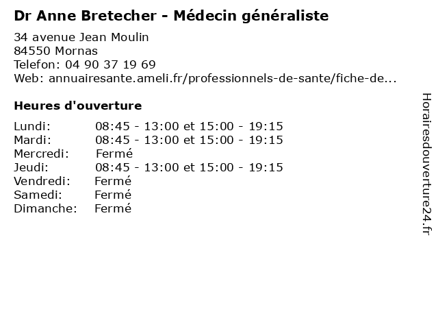 | Lundi | 08:45-13:00 et 15:00-19:15 |