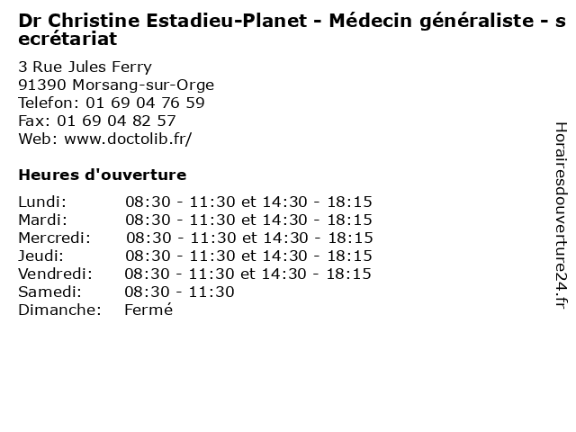 | Mercredi | 08:30-11:30 et 14:30-18:15 |