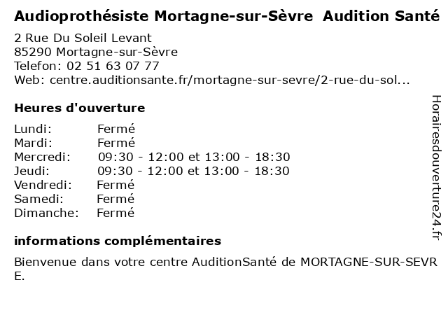 1 Sonance Audition Mortagne-Sur-Sèvre (Distance: 0,98 km) 2 Allée des Peupliers, 85290 Mortagne-sur-Sèvre audition, mortagne, sonance, sur, sèvre 3 Écouter Voir Audition CHOLET (Distance: 7,39 km) 12 Avenue de la Marne, 49300 Cholet audition, cholet, voir, écouter 4 Audioprothésiste Cholet Audition Santé (Distance: 8,31 km) 10 bis Place Du Mail, 49300 Cholet audiologie, audioprothésiste, audition, cholet, santé 6 Audioprothésiste Krys Audition (Distance: 11,59 km) Centre Commercial Carrefour, 49300 Cholet audiologie, audioprothésiste, audition, krys  |