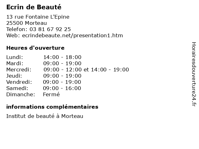 | Mercredi | 09:00-12:00 et 14:00-19:00 |