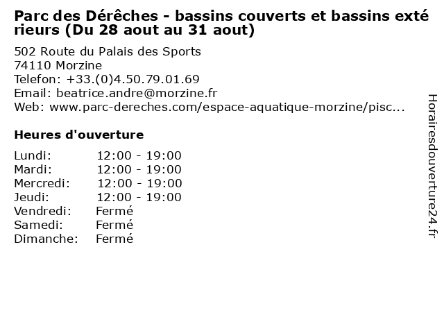 1 Parc des Dérêches - Bassins couverts (Du 29 mai au 23 juin) (Distance: 0,00 km) 502 Route du Palais des Sports, 74110 Morzine 23, 29, aqua, aquatique, au, bassins, couverts, des, du, dérêches, juin, mai, parc, piscine 2 Parc des Dérêches - bassins couverts et du bassin de 50m (Du 24 juin au 7 juillet) (Distance: 0,00 km) 502 Route du Palais des Sports, 74110 Morzine 24, 50m, aqua, aquatique, au, bassin, bassins, couverts, de, des, du, dérêches, et, juillet, juin, parc, piscine 3 Parc des Dérêches - toutes les installations (Du 8 juillet au 27 août) (Distance: 0,00 km) 502 Route du Palais des Sports, 74110 Morzine 27, août, aqua, aquatique, au, des, du, dérêches, installations, juillet, les, parc, piscine, toutes 4 Déchèterie (du 01/05 au 31/11) (Distance: 12,28 km) - La Joux, 74390 Châtel 01/05, 31/11, au, du, déchèterie, gravats, huiles usées, la réception des déchets et écocentres, les appareils électroménagers, les déchets verts, papier et carton en quantité 5 Déchèterie (du 01/12 au 31/04) (Distance: 12,28 km) - La Joux, 74390 Châtel 01/12, 31/04, au, du, déchèterie, gravats, huiles usées, la réception des déchets et écocentres, les appareils électroménagers, les déchets verts, papier et carton en quantité 6 |