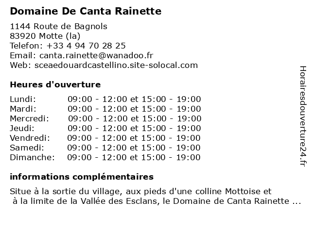 2 Le Domaine Du Mas D'Or (Distance: 8,72 km) 372 Route Départementale 562, 83830 Callas d'or, domaine, du, le, mas 3 Hotel Domaine Rabiega (Distance: 10,64 km) 516 Chemin du Cros d'Aimar, 83300 Draguignan bar, domaine, hotel, rabiega, restaurant, service 4 SCEA DU DOMAINE DE JALE (Distance: 12,15 km) 1 Route De St Tropez, 83550 Vidauban de, domaine, du, jale, scea 5 Domaine des Nibas (Distance: 13,05 km) 9130 route de Garde Freinet, 83550 Vidauban alcool, blanc, bordeaux, caviste, champagne, des, domaine, nibas, vignobles, vins 6 Hotel Domaine de l'Arnaude (Distance: 13,71 km) 692 Route de Vidauban, 83510 Lorgues bar, de, domaine, hotel, l'arnaude, restaurant, service |