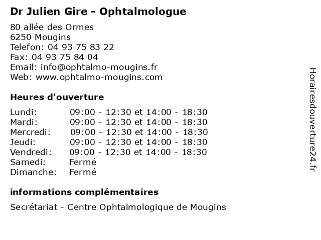 1 Dr Hervé Rouhette - Ophtalmologue (Distance: 0,00 km) 80 allée des Ormes, 06250 Mougins consultation, docteur, dr, hervé, med, médecin, médecine, ophtalmologue, rouhette, traitement 2 Dr Matthieu Conte - Ophtalmologue (Distance: 0,00 km) 80 allée des Ormes, 06250 Mougins consultation, conte, docteur, dr, matthieu, med, médecin, médecine, ophtalmologue, traitement 3 Dr Ivana Svoren - Ophtalmologue (Distance: 0,00 km) 80 allée des Ormes, 06250 Mougins consultation, docteur, dr, ivana, med, médecin, médecine, ophtalmologue, svoren, traitement 4 Julien Felix D.C - Chiropracteur (Distance: 1,17 km) 427 Avenue Font Roubert, 06250 Mougins chiropracteur, chiropratique, colonne vertébrale, d.c, douleur, felix, julien 5 Maître Julien Tamagno - Avocat (Distance: 3,75 km) 100 rue Albert Caquot, 06410 Biot avocat, avocate, avocats, civils, droits, julien, juridiques, maître, tamagno 6 Julien Casagrande - Ostéopathe (Distance: 4,71 km) 12 boulevard Paul Doumer, 06110 Le Cannet casagrande, consultation, crânienne, docteur, julien, manipulations, massage, médecin, naturopathie, nutrition, ostéopathe, pédiatrie, soin, sport |