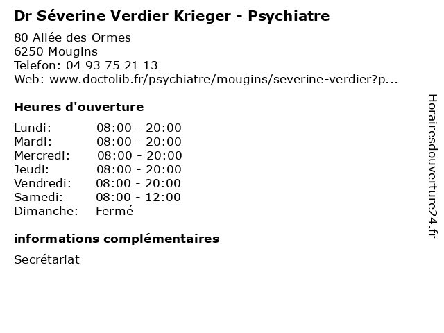 1 Dr Leslie Djian-Serfaty - Psychiatre (Distance: 0,01 km) 80 Allée des Ormes, 06250 Mougins djian, dr, leslie, psy, psychiatre, sante, serfaty, soins 2 Dr Martine Collomb - Psychiatre (Distance: 0,23 km) 122 Avenue du Docteur Maurice Donat, 06250 Mougins collomb, dr, folie, martine, psychiatre, psychiatrie, psychiatrique 4 Séverine Marchand - Masseur-kinésithérapeute (Distance: 3,96 km) 1090 Voie Julia, 06220 Vallauris consultation, docteur, kinésithérapeute, marchand, masseur, med, médecin, severine, séverine, traitement 5 Dr Ricq Olivier - Psychiatre (Distance: 5,36 km) 91 Boulevard carnot, 06400 Cannes cannes, docteur, dr, olivier, psychiatre, ricq 6 Dr Serge Lunacek - Psychiatre (Distance: 6,43 km) 70 Rue d'Antibes, 06400 Cannes consultation, docteur, dr, lunacek, psychiatre, psychiatrie, santé, secrétariat, serge |