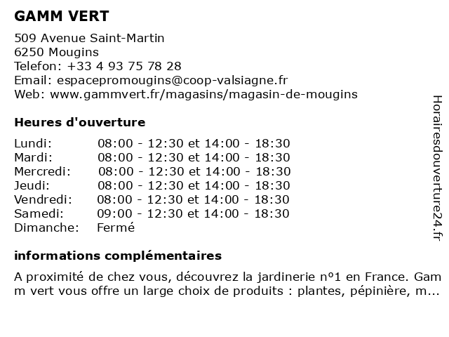 | Samedi | 09:00-12:30 et 14:00-18:30 |