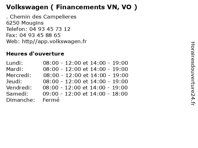 1 Volkswagen ( Financements VN, VO ) (Distance: 8,95 km) . Carrefour du Chataignier, 06600 Antibes automobiles, concessionnaire, financements, garage, motos, vn, vo, volkswagen 2 Volkswagen (Distance: 0,00 km) . Chemin des Campelieres, 06250 Mougins automobiles, concessionnaire, garage, motos, volkswagen 3 Volkswagen (Activités Véhicules Neufs) (Distance: 0,00 km) . Chemin des Campelieres, 06250 Mougins activités, automobiles, concessionnaire, garage, motos, neufs, volkswagen, véhicules 4 Volkswagen ( Activités Véhicules d’Occasion) (Distance: 0,00 km) . Chemin des Campelieres, 06250 Mougins activités, automobiles, concessionnaire, d’occasion, garage, motos, volkswagen, véhicules 5 Volkswagen ( Atelier Mécanique ) (Distance: 0,00 km) . Chemin des Campelieres, 06250 Mougins atelier, automobiles, concessionnaire, garage, motos, mécanique, volkswagen 6 Volkswagen ( Atelier Peinture Carrosserie ) (Distance: 0,00 km) . Chemin des Campelieres, 06250 Mougins atelier, automobiles, carrosserie, concessionnaire, garage, motos, peinture, volkswagen |