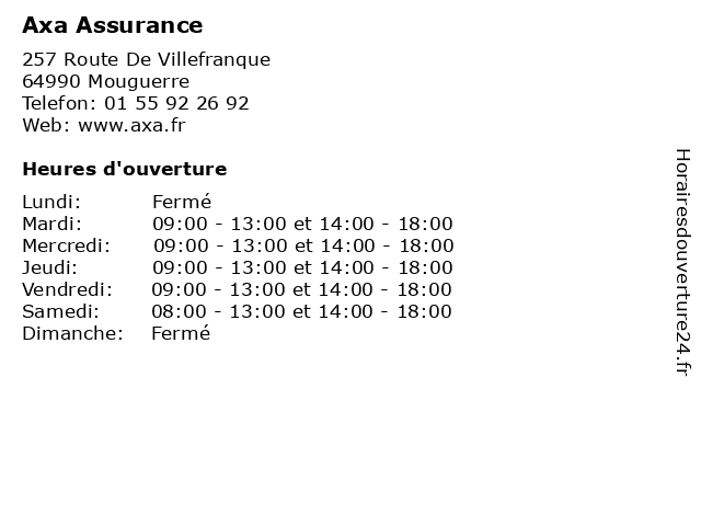 1 Axa Assurance (Distance: 2,42 km) . Route Departementale 932, 64480 Ustaritz assurance, assurance prêt, assurances, axa, services 2 Axa Assurance (Distance: 6,14 km) 11 Boulevard Alsace Lorraine, 64100 Bayonne assurance, assurance prêt, assurances, axa, services 3 Axa Assurance (Distance: 6,63 km) 40 Rue Jules Labat, 64100 Bayonne assurance, assurance prêt, assurances, axa, services 4 Axa Assurance (Distance: 8,16 km) 55 Avenue De Bayonne, 64600 Anglet assurance, assurance prêt, assurances, axa, services 5 Axa Assurance (Distance: 10,95 km) . Allee Edmond Rostand, 64250 Cambo Les Bains assurance, assurance prêt, assurances, axa, services 6 Axa Assurance (Distance: 11,47 km) 20 Rue Du Lycee, 64202 Biarritz assurance, assurance prêt, assurances, axa, services |
