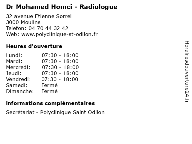 1 Dr Mohamed Souib - Anesthésiste (Distance: 0,00 km) 32 avenue Etienne Sorrel, 03000 Moulins anesthésiste, consultation, docteur, dr, med, mohamed, médecin, souib, traitement 2 Restaurant Afrah (Distance: 38,21 km) 50 Rue Pierre Semard, 03260 Saint-Germain-des-Fossés afrah, debara, mohamed, restaurant, restaurants 3 Feqri Mohamed (Distance: 39,65 km) 8 Place Emile Guillaumin, 03120 Lapalisse divers, détail, feqri, magasins, mohamed, nra 4 Dr Marta Nowak Mohamed - Pédiatre (Distance: 43,89 km) 75 Allée des Ailes, 03200 Vichy dr, marta, mohamed, nowak, pedicure, pied, podologue, pédiatre, sante 5 Dr Mohamed Bennaga - Médecin généraliste (Distance: 51,43 km) 1 avenue Patrick Guillot, 58033 Nevers bennaga, consultation, docteur, dr, généraliste, med, medecine, medical, mohamed, médecin, traitement 6 Dr Mohamed Mahieddine - Néphrologue (Distance: 51,43 km) 1 avenue Patrick Guillot, 58033 Nevers consultation, docteur, dr, mahieddine, med, medecine, medical, mohamed, médecin, néphrologue, traitement |