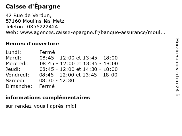 1 Caisse d'Épargne (Distance: 3,94 km) 47 Rue Général Franiatte,, 57950 Montigny-lès-Metz banque, caisse, carte, d'epargne, d'épargne, services 2 Caisse d'Épargne (Distance: 4,19 km) 12 Place de la République, 57130 Ars-sur-Moselle banque, caisse, carte, d'epargne, d'épargne, services 3 Caisse d'Épargne (Distance: 5,25 km) 123-125 Rue aux Arènes, 57000 Metz banque, caisse, carte, d'epargne, d'épargne, services 4 Caisse d'Épargne (Distance: 6,65 km) 25 Rue de la Croix Saint-Joseph,, 57155 Marly banque, caisse, carte, d'epargne, d'épargne, services 5 Caisse d'Épargne (Distance: 7,49 km) 1 Rue Jean Antoine Chaptal,, 57070 Metz banque, caisse, carte, d'epargne, d'épargne, services 6 Caisse d'Épargne (Distance: 7,49 km) 2 Rue Jean Antoine Chaptal,, 57070 Metz banque, caisse, carte, d'epargne, d'épargne, services |