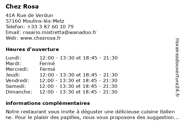 1 Chez Rosa (Distance: 0,00 km) 41 Rue De Verdun, 57160 Moulins Les Metz bar, bistro, bistrot, brasserie, café, chez, pub, restaurant, restauration, resto, rosa 2 Chez Enzo Moulins (Distance: 2,37 km) 15 Rue de Chaponost, 57160 Moulins-lès-Metz chez, commande, déjeuner, dîner, enzo, gastronomique, moulins, nourriture, restaurant 3 Chez Pierrot (Distance: 4,42 km) 1 Allée Marguerite, 57950 Montigny-lès-Metz chez, metz, montigny, pierrot, pizzeria, restaurant 4 Chez Mauricette (Distance: 4,70 km) - rue George Aimé, 57000 Metz chez, mauricette, salsaison, traiteur, vins 5 Chez Monsieur (Distance: 4,79 km) 50 Rue de la Chapelle, 57000 Metz chez, cuisine, etc, metz, monsieur, restaurant 6 Chez Baptiste (Distance: 4,96 km) 13 rue Lafayette, 57000 Metz baptiste, chez, cuisine, metz, restaurant |