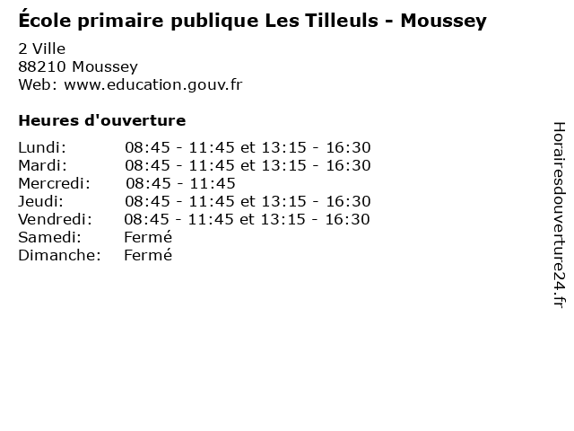| Mardi | 08:45-11:45 et 13:15-16:30 |