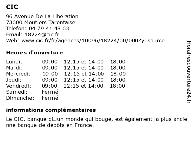 1 CIC (Distance: 10,30 km) Route De La Montee, 73550 Les Allues cic, compagnie de téléphone, organisme d'assurance 2 CIC (Distance: 11,14 km) 110 Rue De La Croisette, 73120 Courchevel cic, compagnie de téléphone, organisme d'assurance 3 CIC (Distance: 12,09 km) La Plagne Centre, 73210 La Plagne Tarentaise cic, compagnie de téléphone, organisme d'assurance 4 Crédit Industriel et Commercial (CIC) (Distance: 0,01 km) 96 Avenue de la Libération, 73600 Moutiers-Tarentaise agence, assurance, banque, cic, commercial, credit industriel et commercial, crédit, et, industriel 5 Crédit Industriel et Commercial (CIC) (Distance: 10,28 km) - Route de la Montée, 73550 Les Allues banque, banques, cic, commercial, commerciales, crédit, et, industriel, lyonnaise, nationales 6 Crédit Industriel et Commercial (CIC) (Distance: 11,08 km) 110 Rue de la Croisette, 73120 Saint-Bon-Tarentaise banque, banques, cic, commercial, commerciales, crédit, et, industriel, lyonnaise, nationales |