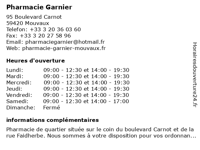 | Lundi | 09:00-12:30 et 14:00-19:30 |