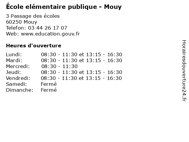 | Mardi | 08:30-11:30 et 13:15-16:30 |