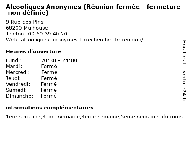 Termes de recherche pour Alcooliques Anonymes (Réunion fermée - fermeture non définie):reunion, non, fermeture, alcooliques, anonymes, définie, fermée |