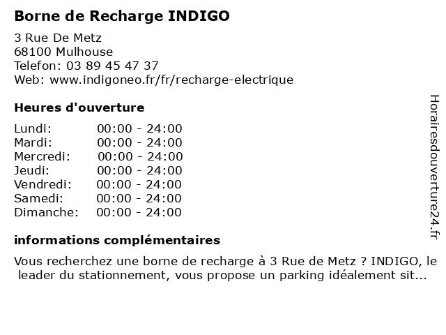 1 Borne de Recharge INDIGO (Distance: 0,18 km) 1 Rue D'anvers, 68100 Mulhouse borne, de, indigo, recharge 2 Borne de Recharge INDIGO (Distance: 0,86 km) Rue Camille Flammarion, 68100 Mulhouse borne, de, indigo, recharge 3 Parking Indigo Mulhouse Centre (Distance: 0,02 km) 6 Rue De Metz, 68100 Mulhouse borne de recharge pour véhicules électriques, centre, indigo, mulhouse, parking 4 Parking Indigo Mulhouse Porte Jeune (Distance: 0,18 km) 1 Rue D'anvers, 68100 Mulhouse borne de recharge pour véhicules électriques, indigo, jeune, mulhouse, parking, porte 5 Parking Indigo Mulhouse Gare Bâle (Distance: 0,35 km) 28bis Rue De Bâle, 68100 Mulhouse borne de recharge pour véhicules électriques, bâle, gare, indigo, mulhouse, parking 6 Parking Indigo Mulhouse Maréchaux (Distance: 0,49 km) 23 Rue Du Couvent, 68100 Mulhouse borne de recharge pour véhicules électriques, indigo, maréchaux, mulhouse, parking |