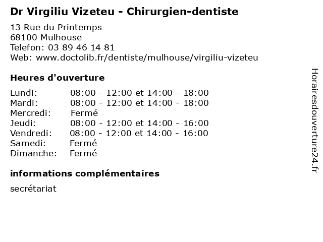 1 Dr Raluca Antonina Vizeteu-Malaeanu - Ophtalmologue (Distance: 6,60 km) 20 Rue de Kingersheim, 68270 Wittenheim antonina, dr, malaeanu, ophtalmologie, ophtalmologistes, ophtalmologue, raluca, vision, vizeteu 2 Dr. Francis Alloncle- Dentiste (Distance: 0,33 km) 8 Rue du Parc, 68100 Mulhouse alloncle, dentiste, docteur, dr., francis, medecins, sante 3 Dr Philippe Duris - Chirurgien-dentiste (Distance: 0,53 km) 8 Rue des Bonnes Gens, 68100 Mulhouse chirurgien, consultation, dentiste, docteur, dr, duris, med, philippe, secrétariat 4 ALTES - Alsace téléservices (Distance: 0,53 km) 4 Rue des Bonnes Gens, 68100 Mulhouse agence, alsace, altes, secrétariat, télémarketing, téléprospection, téléservices 5 Dr Olguta Negoescu - Chirurgien-dentiste (Distance: 0,53 km) 2 Avenue Roger Salengro, 68100 Mulhouse chirurgien, consultation, dentiste, docteur, dr, med, negoescu, olguta, secrétariat 6 Dr Simon Foessel - Chirurgien-dentiste (Distance: 0,58 km) 4 Rue de Metz, 68100 Mulhouse 68100, cabinet, chirurgien, dentiste, docteur, dr, foessel, mulhouse, simon |