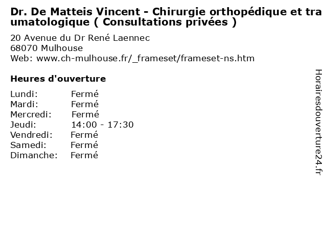 1 Dr.Weber Pierre - Chirurgie orthopédique et traumatologique (Distance: 0,00 km) 20 Avenue du Dr René Laennec, 68070 Mulhouse chirurgie, docteur, dr.weber, et, medecins, orthopédique, pierre, sante, traumatologique 2 Dr. Boreux Anne - Chirurgie orthopédique et traumatologique (Consultations publiques) (Distance: 0,00 km) 20 Avenue du Dr René Laennec, 68070 Mulhouse anne, boreux, chirurgie, consultations, docteur, dr., et, medecins, orthopédique, publiques, sante, traumatologique 3 Dr. De Matteis Vincent - Chirurgie orthopédique et traumatologique ( Consultations publiques ) (Distance: 0,00 km) 20 Avenue du Dr René Laennec, 68070 Mulhouse chirurgie, consultations, de, docteur, dr., et, matteis, medecins, orthopédique, publiques, sante, traumatologique, vincent 4 Dr. Hamousz Cristian - Chirurgie orthopédique et traumatologique ( Consultations privées ) (Distance: 0,00 km) 20 Avenue du Dr René Laennec, 68070 Mulhouse chirurgie, consultations, cristian, docteur, dr., et, hamousz, medecins, orthopédique, privées, sante, traumatologique 5 Dr. Lallemant Philippe- Anesthésie ( Consultations privées) (Distance: 0,00 km) 20 Avenue du Dr René Laennec, 68070 Mulhouse anesthésie, consultations, docteur, dr., lallemant, medecins, philippe, privées, sante 6 Dr. Hamade Amer - Angiologie ( Consultations privées ) (Distance: 0,00 km) 20 Avenue du Dr René Laennec, 68070 Mulhouse amer, angiologie, consultations, docteur, dr., hamade, medecins, privées, sante |