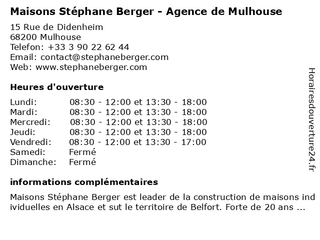 1 Maisons Aera (Distance: 1,81 km) 12 Avenue du Président Kennedy, 68100 Mulhouse aera, construction, habitat, maison, maisons 2 SAS PINO - Entreprise de Batiment - Rénovation maisons et appartements - Extension & Agrandissement (Distance: 2,16 km) 1 rte Thann Cité De L'habitat, 68460 Lutterbach agrandissement, appartements, batiment, de, entreprise, et, extension, maisons, pino, rénovation, sas 3 Maisons Brand (Distance: 2,26 km) 62 Rue Jacques Mugnier, 68100 Mulhouse agence, brand, immobilière, maisons, projets, promotions 4 Dr Stéphane Lefebvre - Spécialiste en médecine physique et de réadaptation (Distance: 2,39 km) 47 Boulevard Alfred Wallach, 68100 Mulhouse consultation, de, docteur, dr, en, et, lefebvre, médecine, physique, réadaptation, santé, spécialiste, stéphane 5 Maisons du Monde (Distance: 3,22 km) n/a Napoléon, 68313 Illzach - Mulhouse armchairs, curtains, du, frameworks, furniture, maisons, monde 6 |