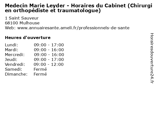 Termes de recherche pour Medecin Marie Leyder - Horaires du Cabinet (Chirurgien orthopédiste et traumatologue):du, et, marie, horaires, cabinet, services, santé, docteur, médecin, chirurgien, orthopédiste, traumatologue, leyder |