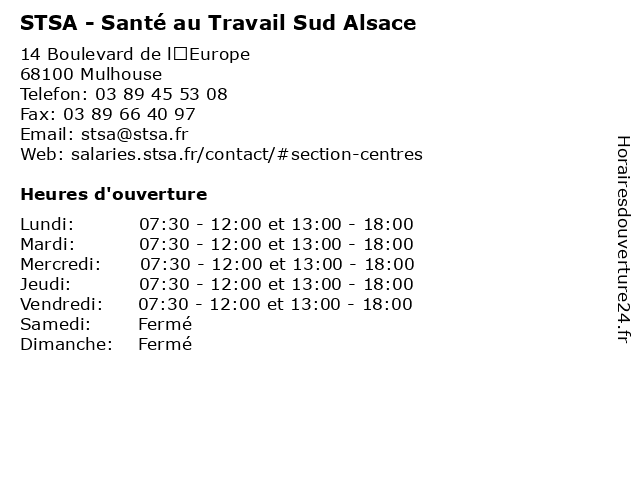 1 STSA - Santé au Travail Sud Alsace (Distance: 2,15 km) 155 Avenue Aristide Briand, 68200 Mulhouse alsace, au, bilan, centre, de, santé, stsa, sud, travail 2 STSA - Santé au Travail Sud Alsace (Distance: 2,94 km) 60 rue de Sausheim, 68110 Illzach alsace, au, bilan, centre, santé, stsa, sud, travail 3 STSA - Santé au Travail Sud Alsace (Distance: 6,84 km) 7 rue de la Charente, 68270 Wittenheim alsace, au, bilan, centre, de, santé, stsa, sud, travail 4 STSA - Santé au Travail Sud Alsace (Distance: 16,24 km) - Avenue du 8ème Régiment Hussards, 68130 Altkirch alsace, au, bilan, centre, de, santé, stsa, sud, travail 5 Chambre De Métiers D'Alsace Section de Mulhouse (Distance: 0,07 km) 12 Boulevard de l'Europe, 68100 Mulhouse chambre, d'alsace, de, mulhouse, métiers, section 6 Mutuelle Complementaire d'Alsace (Distance: 0,10 km) 5 Boulevard de l'Europe, 68100 Mulhouse complementaire, d'alsace, mutuelle |