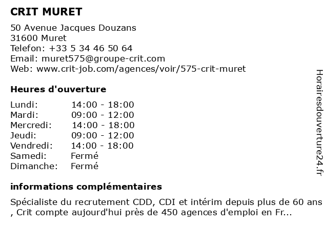 1 CRIT TOULOUSE Experts & Cadres (Distance: 16,68 km) 445 L'Occitane, 31670 Labege cadres, crit, experts, toulouse 2 CRIT TOULOUSE Industrie (Distance: 19,10 km) 94 Avenue des Minimes, 31200 Toulouse crit, industrie, toulouse 3 CRIT TOULOUSE BTP 2nd oeuvre Maintenance (Distance: 19,96 km) 60 Rue Benjamin Baillaud, 31500 Toulouse 2nd, btp, crit, maintenance, oeuvre, toulouse 4 CRIT TOULOUSE BTP Gros oeuvre & TP (Distance: 19,96 km) 60 Rue Benjamin Baillaud, 31500 Toulouse btp, crit, gros, oeuvre, toulouse, tp 5 CRIT BLAGNAC Aéronautique (Distance: 20,74 km) 24 Avenue Georges Brassens, 31700 Blagnac aéronautique, blagnac, crit 6 CRIT TOULOUSE Transport-Logistique (Distance: 21,73 km) Place Paul Riché, 31200 Toulouse crit, logistique, toulouse, transport |