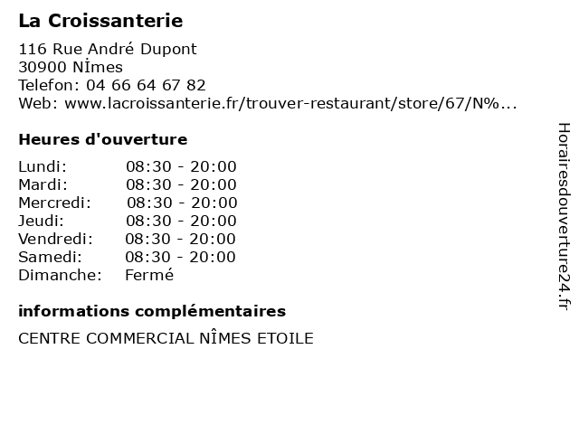 1 La Croissanterie (Distance: 1,80 km) 400 Avenue Claude Baillet, 30900 Nîmes boissons, croissanterie, la, restauration, sandwicherie, snacking 3 La Croissanterie (Distance: 2,72 km) 22 Bd Gambetta, 30051 30051 Nimes beaute, cafe, chaussures, croissanterie, enfants, la, lingerie, mode femmes, mode hommes, restaurant, sport 4 La Croissanterie (Distance: 41,56 km) 2 Place de Lisbonne, 34000 Montpellier alimentation, boulangerie, croissanterie, la, restaurant, sandwichs, viénoiseries 5 La Croissanterie (Distance: 44,04 km) - Route des Bords du Rhone, 84130 Le Pontet boulangerie, commerce, croissanterie, la 6 La Croissanterie (Distance: 44,42 km) . Route de Ganges, 34980 St. Clément de Rivière cafe, croissanterie, enfants, homme, la, mode femme, restaurant, servicies |