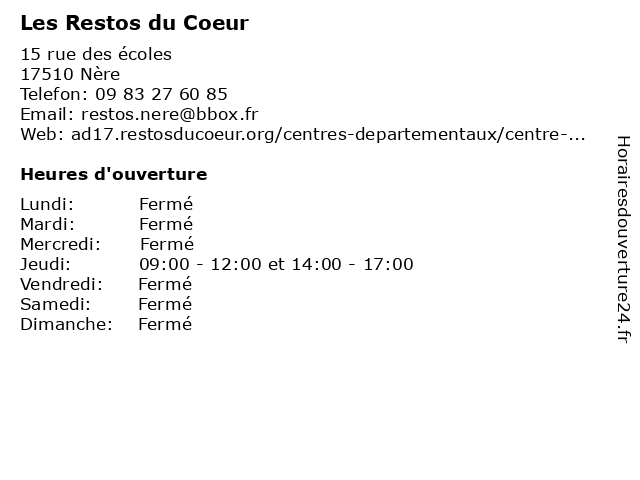 1 Les Restos Du Coeur (Distance: 23,81 km) 56 Avenue de Saint-Jean d'Angely, 17400 Asnières-la-Giraud aides, alimentaire, coeur, du, les, restos, santé, solidarité, soutien 2 Les Restos du Coeur de Charente Maritime (Distance: 25,97 km) 56 route de Saint Jean d'Angely, 17400 Asnieres La Giraud aide, association, bénévolat, charente, coeur, de, du, humanitaire, les, maritime, restos, ’hébergement 3 Les Restos Du Coeur (Distance: 26,50 km) 49 rue de la République, 17770 Burie aide, coeur, dons, du, les, restos, solidarité, vente 4 Les Restos Du Coeur (Distance: 29,26 km) - Rue de la Croix Blanche, 79360 Beauvoir-sur-Niort aides, alimentaire, coeur, du, les, restos, santé, solidarité, soutien 5 Les Restos Du Coeur (Distance: 32,03 km) 3 Rue de l’Ancienne Mairie, 79370 Celles-sur-Belle aides, alimentaire, coeur, du, les, restos, santé, solidarité, soutien 6 Les Restos Du Coeur (Distance: 34,68 km) 7 Boulevard des Grands Rocs, 16700 Ruffec aides, alimentaire, coeur, du, les, restos, santé, solidarité, soutien |
