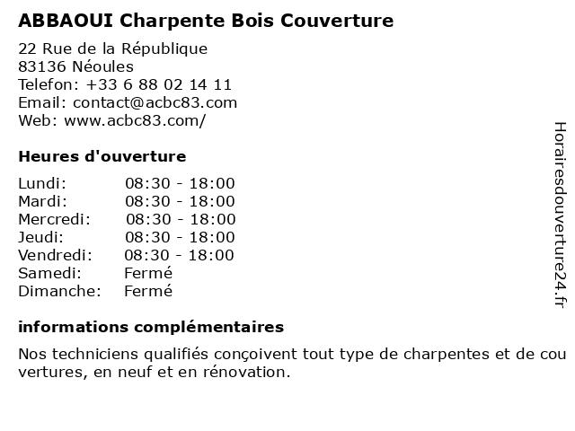 2 Déco Charpente (Distance: 7,05 km) 10 ZA des Fontaites, 83136 Forcalqueiret abris, charpente, constructeurs, déco, jardin, projets 3 Concept Bois - Charpentier (Distance: 11,71 km) - ZAE les Ferrages du Paradou, 83170 Tourves bois, charpentier, concept, tourves 4 Chaleyssin Charpente (Distance: 12,08 km) 568 Chemin de la Limatte, 83870 Signes bardage, bois, chaleyssin, charpente, construction métallique, couverture, rénovation, toiture 5 Le Poêle A Bois SARL (Distance: 12,75 km) 130 Avenue de l'Arlésienne, 83210 Solliès-Pont bois, le, poêle, sarl 6 |