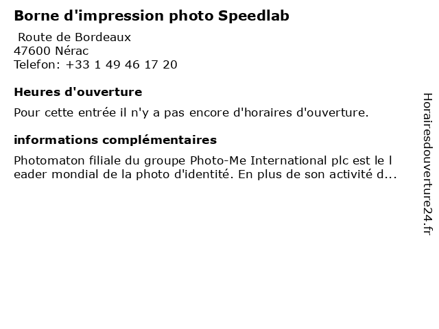 2 Camara (Distance: 21,03 km) 10 Rue Charron, 32100 Condom accessories, audio, camara, camcorders, photo, printing, video 4 Borne d'impression photo Speedlab (Distance: 24,59 km) Allée Bigorre, 47550 Boé borne, d'impression, photo, speedlab 5 Borne d'impression photo Speedlab (Distance: 28,63 km) 19 Rue de Suriray, 47400 Tonneins borne, d'impression, photo, speedlab 6 Borne d'impression photo Speedlab (Distance: 39,51 km) Allée Bordeaux, 47300 Bias borne, d'impression, photo, speedlab |