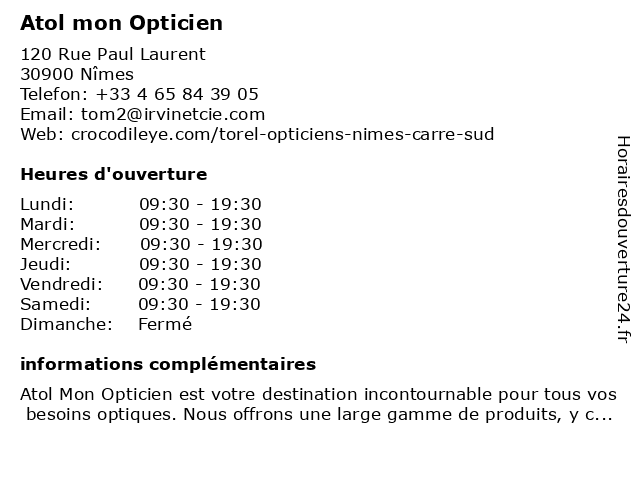 1 Atol Mon Opticien (Distance: 7,55 km) Chemin de Vermaciel, 30820 Caveirac atol, atol les opticiens, atol mon opticien, lentilles, lunettes de soleil, lunettes de vue, mon, opticien, opticien caveirac 2 Atol Mon Opticien (Distance: 9,99 km) 65 Avenue André Mazoyer, 30129 Manduel atol, atol les opticiens, atol mon opticien, lentilles, lunettes de soleil, lunettes de vue, mon, opticien, opticien manduel 3 Atol Mon Opticien (Distance: 15,83 km) 36 Bis Rue Gambetta, 30800 Saint-Gilles atol, atol les opticiens, atol mon opticien, lentilles, lunettes de soleil, lunettes de vue, mon, opticien, opticien saint-gilles 4 Atol Mon Opticien (Distance: 19,92 km) 192 Avenue Avitus, 30300 Beaucaire atol, atol les opticiens, atol mon opticien, lentilles, lunettes de soleil, lunettes de vue, mon, opticien, opticien beaucaire 6 Opticien NIMES Générale d'Optique (Distance: 0,22 km) 148 Rue Jean Lauret, 30900 Nîmes d'optique, examen de la vue, générale, lentilles de contact, lentilles progressives, lunette ray ban, lunettes, lunettes anti-lumière bleue, lunettes de conduite de nuit, lunettes de conduites de nuit, lunettes de soleil, lunettes de soleil pour enfant, lunettes de soleil pour femme, lunettes de soleil pour homme, lunettes de vue, lunettes de vue femme, lunettes de vue homme, lunettes progressives, nimes, opticien, opticien proche de chez moi, optique, sport à la vue, vérification de la vue |