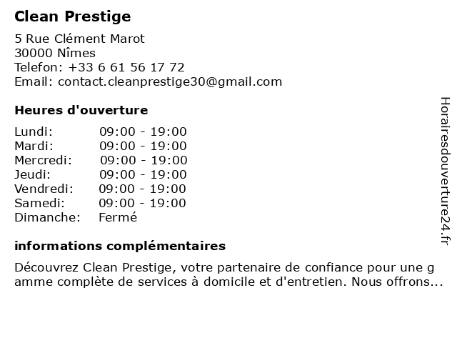 5 Immo Clean Gard (Distance: 6,18 km) 195 rue Guy Arnaud, 30900 Nimes clean, entretien, gard, hygiène, immo, ménage, nettoyage, propreté, services 6 Prestige Courtage (Distance: 6,62 km) 100 route de Nîmes, 30132 Caissargues assurances, courtage, courtier, particuliers, prestige, professionnels |