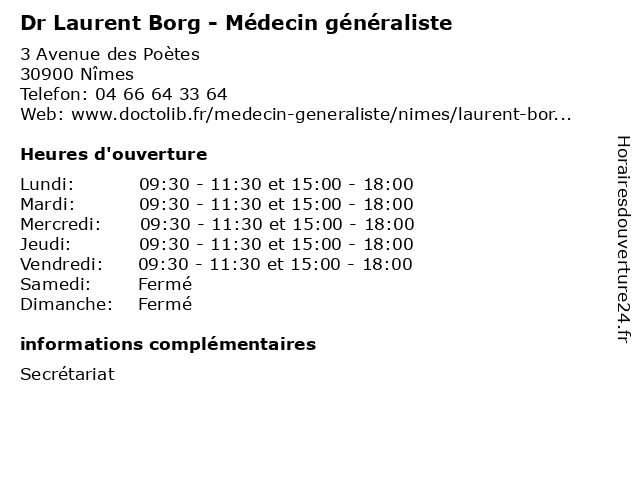 | Mercredi | 09:30-11:30 et 15:00-18:00 |
